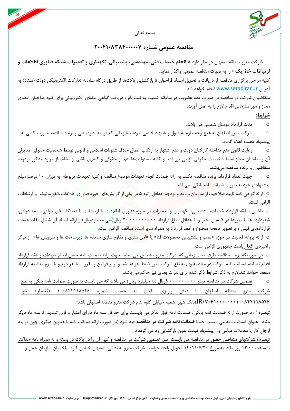 انجام خدمات فنی،مهندسی،پشتیبانی، نگهداری و تعمیرات شبکه فناوری اطلاعات و ارتباطات خط یک