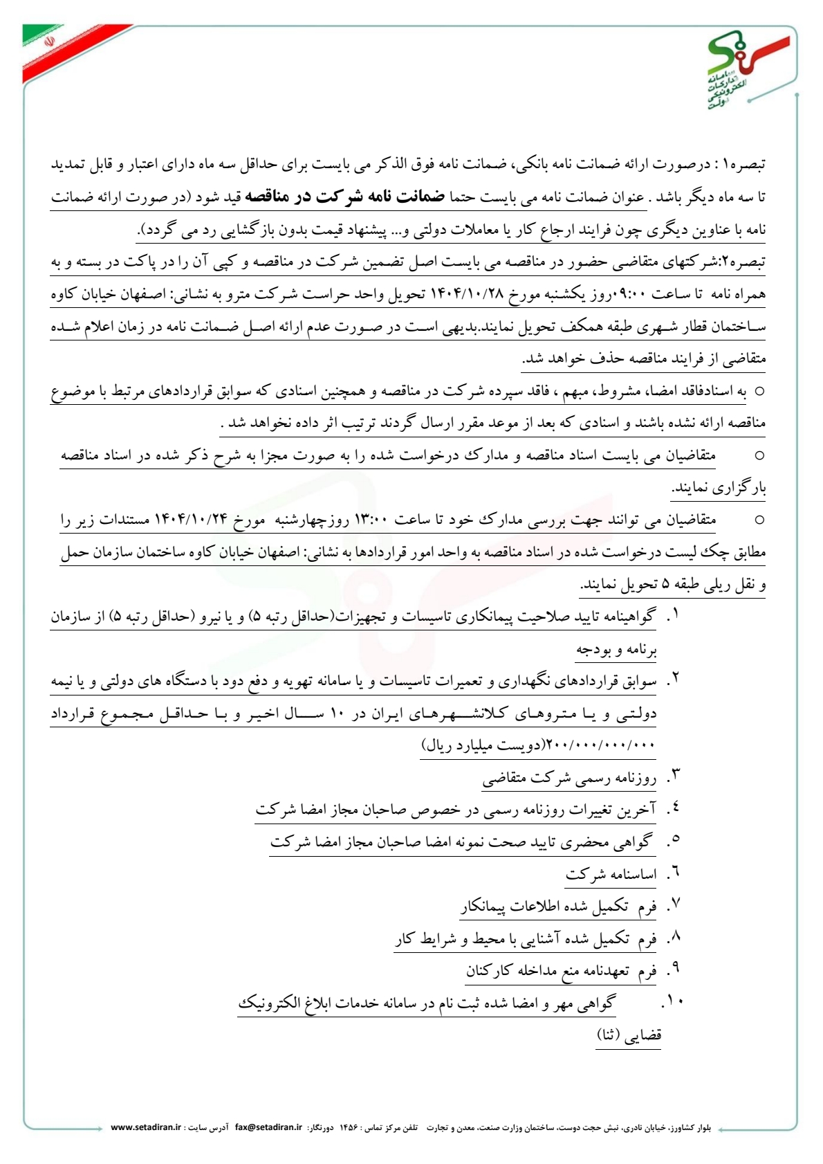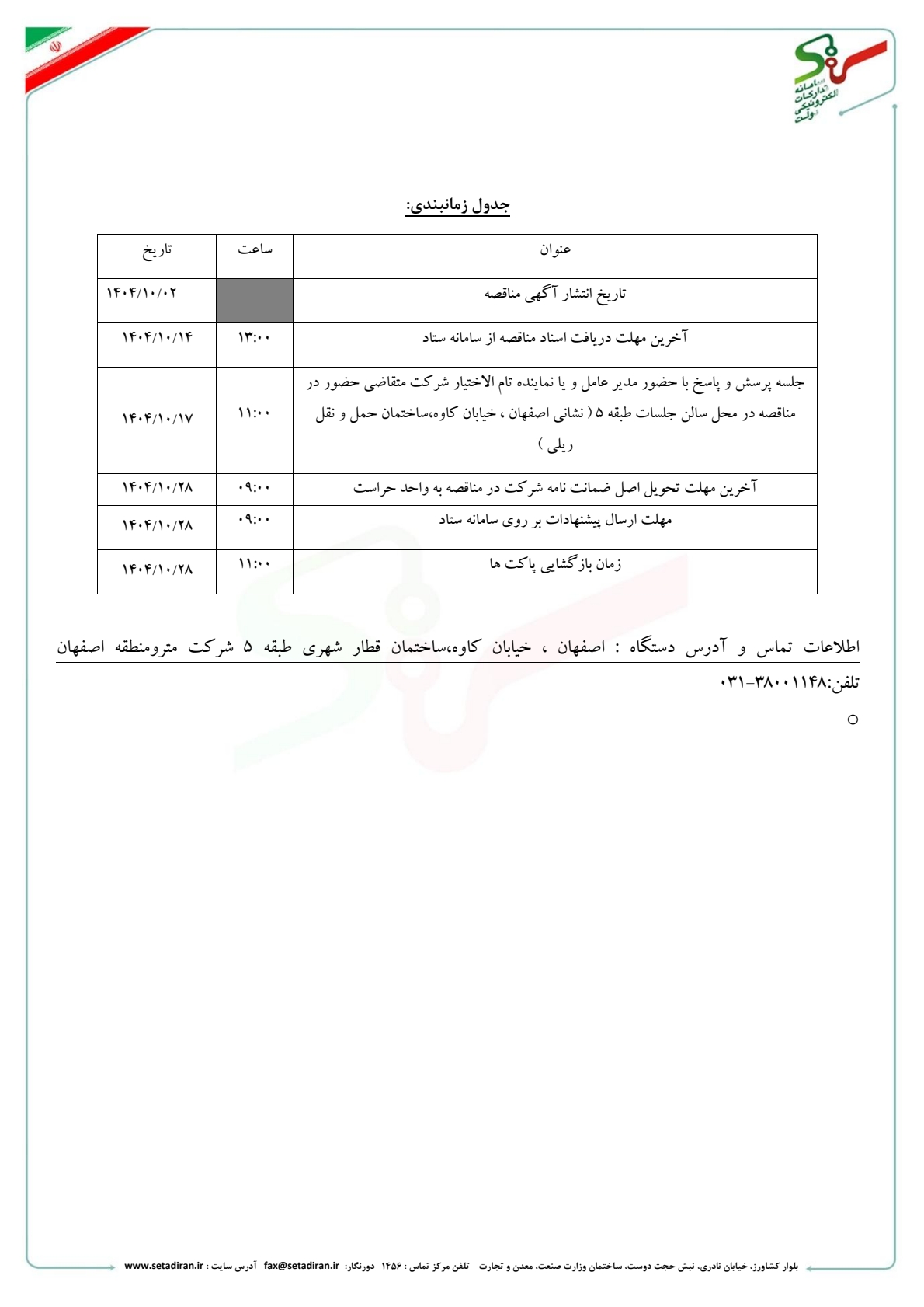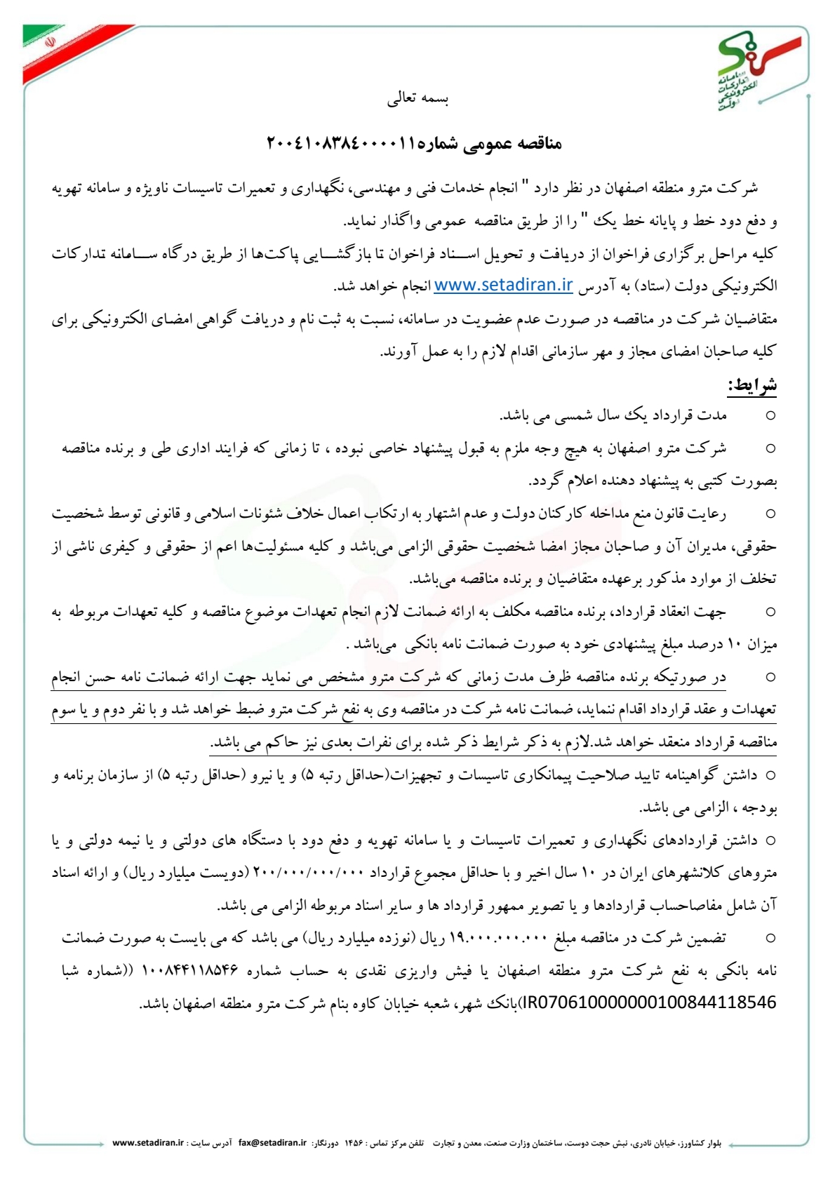 انجام خدمات فنی و مهندسی، نگهداری و تعمیرات تاسیسات ناویژه و سامانه تهویه و دفع دود خط و پایانه خط یک